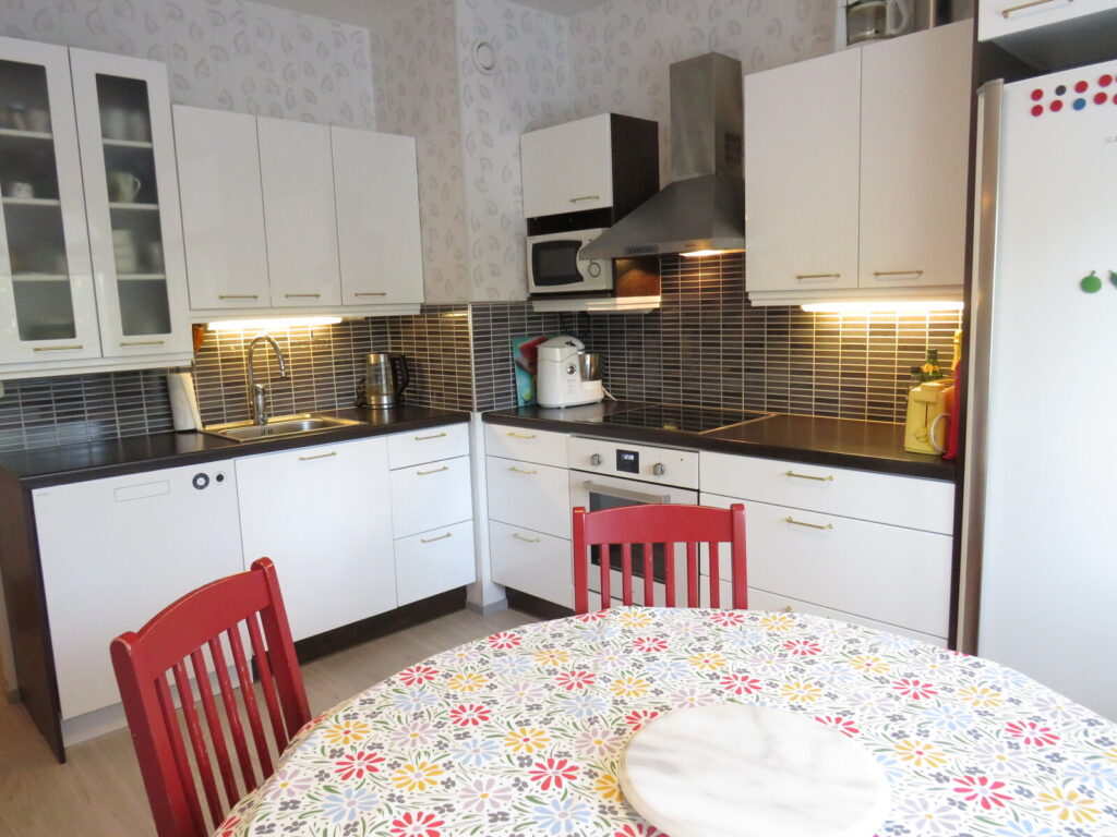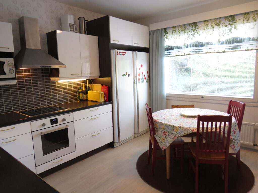 Keittiö | Varustus: jääkaappi, pakastekaappi, liesikupu, kiinteät valaisimet, Liesi: erillisuuni, liesitaso, Lattia: korkki |