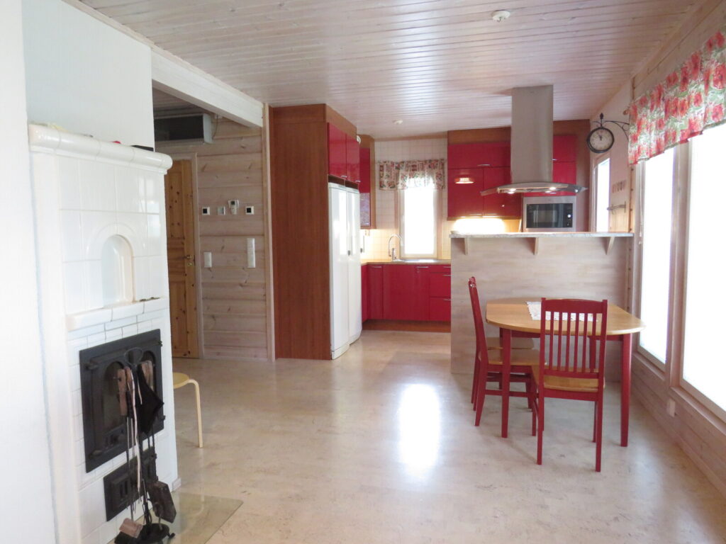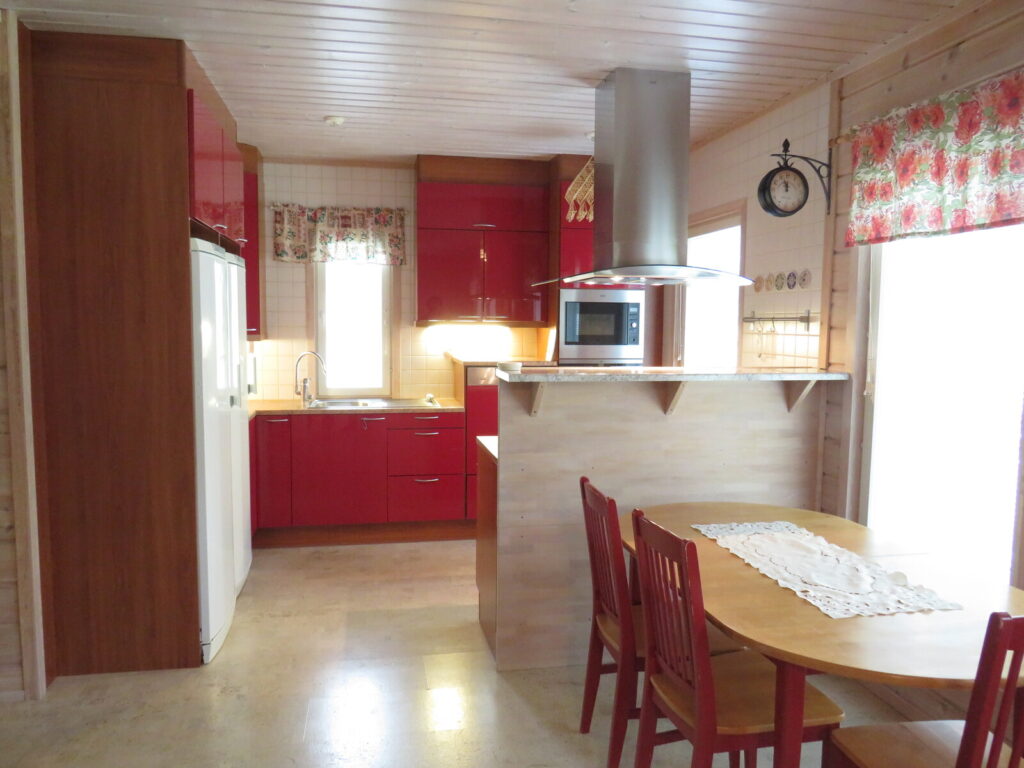 Keittiö Varustus: jääkaappi, pakastekaappi, mikroaaltouuni, astianpesukone, kiinteät valaisimet, liesituuletin / hormi, Liesi: erillisuuni, liesitaso, Lattia: korkki